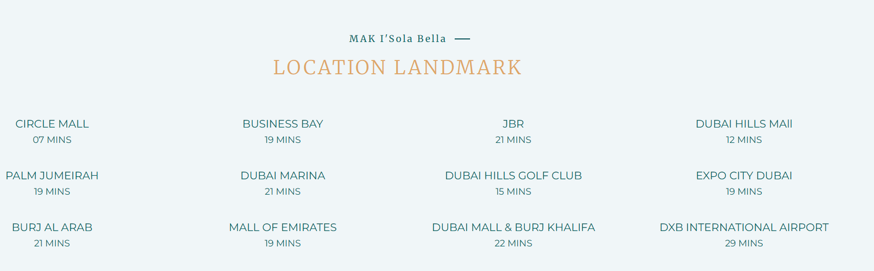 I’Sola Bella is located in Jumeirah Village Circle (JVC), a master development in Dubai, providing easy access to major city destinations within 10-20 minutes. It’s perfect for those seeking tranquility while staying close to key urban hubs.